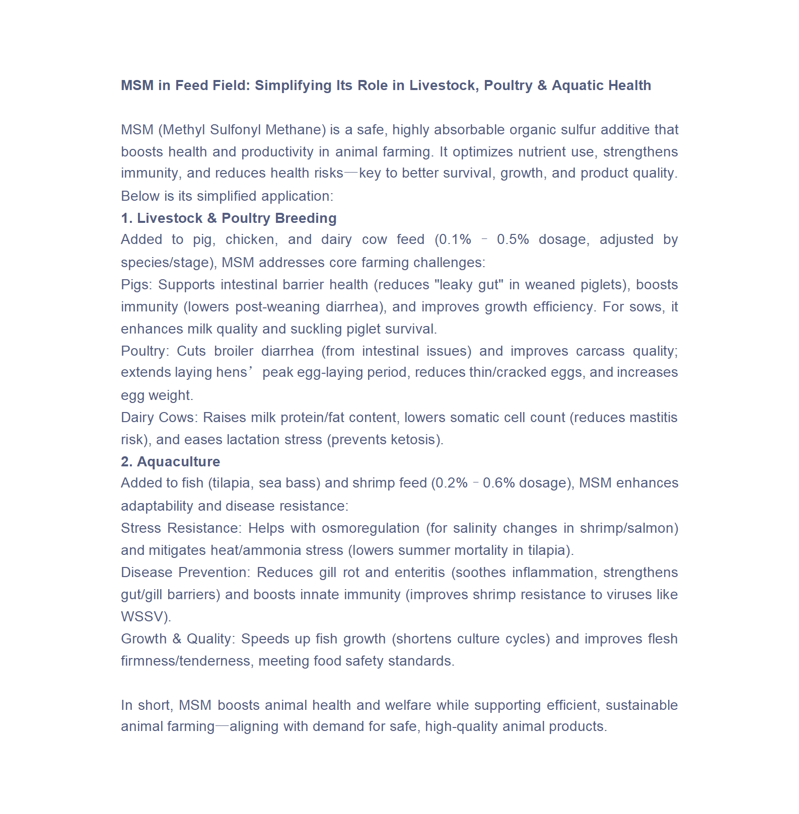 Aquaculture: Used in the feed of fish and shrimp, it enhances their resistance to environmental stress and reduces diseases such as gill rot and enteritis.